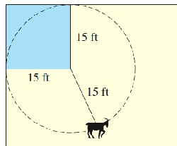 Angela has fenced off a 15-foot square vegetable garden in the corner of her backyard. Her pet goat, Capri, is tethered by a 15-foot rope to the corner of the garden fence, as shown below. What is the area of grass that Capri can reach?