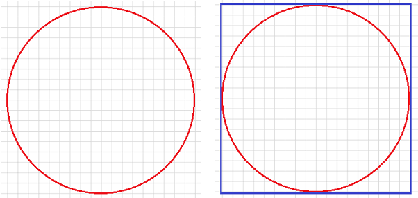 On the circle on the left, put a dot in each square that is completely within the circle. Count the number of squares with dots.