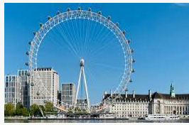 The London Eye, or the Millennium Wheel, is an observation wheel on the South Bank of the River Thames in London. It is 443 feet tall, and the diameter of the wheel is 394 feet. It has 32 "capsules" for passengers.