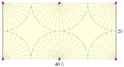 Delbert’s front lawn is 40 feet long and 20 feet wide. He installs sprinklers around the perimeter, as shown below. If the sprinklers are adjusted so that there is no overlap in their range, what is the area of the lawn that will be missed?