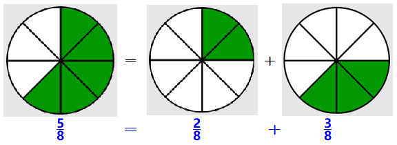 \large{\dfrac{2}{8} + \dfrac{3}{8} = \dfrac{5}{8}} ~~~~ \blert{\dfrac{\text{Add the numerators together.}}{\text{Keep the same denominator.}}}
