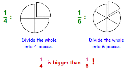 So the number in the denominator tells us the size of each piece: the bigger the denominator, the smaller one piece is.