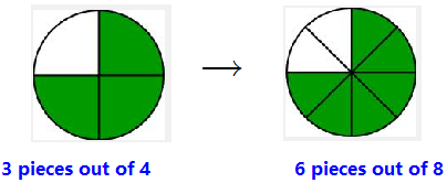 Do you see why that works? For example, if we rewrite \(\dfrac{3}{4}\) as \(\dfrac{6}{8}\text{,}\) we have broken each piece into 2 smaller pieces, so that there are twice as many pieces altogether, and the denominator changes from 4 to 8. But the three pieces in our \(\dfrac{3}{4}\) are also broken into 2 pieces each, so there are now 6 pieces out of 8 in our new fraction.