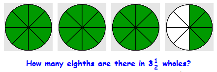 Because there are 8 eighths in one whole, there must be \(3\dfrac{1}{2} \times 8\) eighths in \(3\dfrac{1}{2}\) wholes. So