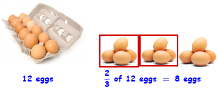 What does it mean to take \(\dfrac{2}{3}\) of something? It means to divide the quantity into 3 equal parts, and then take 2 of them. For instance, to take \(\dfrac{2}{3}\) of 12 eggs, we divide 12 into 3 groups of 4eggs each, and take 2 of those groups of 4 eggs, to get 8 eggs.