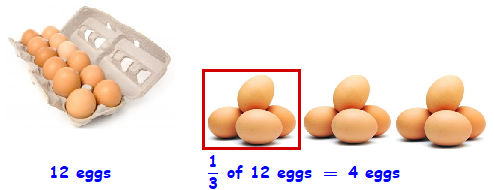 What does it mean to take \(\dfrac{1}{3}\) of something? It means to divide the quantity by 3. For instance, to take \(\dfrac{1}{3}\) of 12 eggs, we divide 12 by 3 and take 4 eggs.