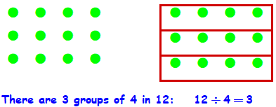 When we divide a number, we are separating it into groups. For example, \(12 \div 4\) means to find how many groups of 4 fit into 12. The answer, of course, is 3; there are 3 groups of 4 in 12.