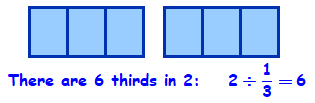 But how about dividing by a fraction? What does it mean to divide a number by \(\dfrac{1}{3}\text{?}\) (Notice that this is NOT the same as dividing by 3!) For example, \(2 \div \dfrac{1}{3}\) means to find the number of thirds in 2 wholes.