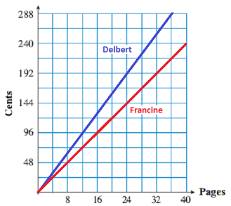 We can write an equation for each of the variables, \(D\text{,}\) Delbert’s copying fees, and \(F\text{,}\) Francine’s copying fees, in terms of the number of pages copied, \(p\text{.}\) We’ll calculate the unit cost in each case.