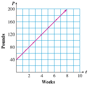 Joshua is saving newspapers for the paper drive at his son’s school. The graph shows the amount of newspaper \(P\) he has saved \(t\) weeks after the paper drive began.