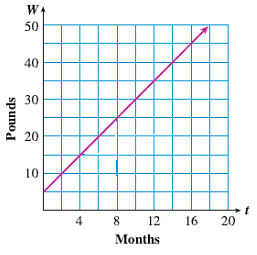 Britney is raising a goat to show at the state fair. The graph shows the goat’s weight \(W\) when it was \(t\) months old.