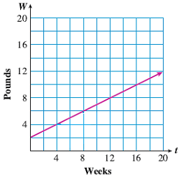 Jason is raising a rabbit for the county fair. The graph shows the rabbit’s weight \(W\) when it was \(t\) weeks old.