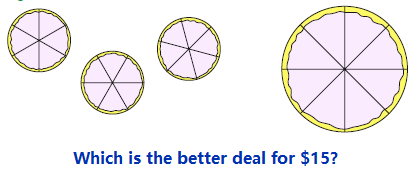 Solve the problem about pizzas that opened this Lesson: Which is the better deal: $15 for three 8-inch pizzas or $15 for one 16-inch pizza?
