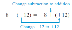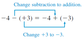 We don’t really have a new rule for subtraction. Instead, we change every subtraction problem to an equivalent addition problem, and then follow the Rules for Addition 7.1.3.