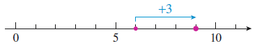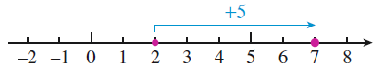 But there are only two directions on the number line, so when we subtract \(-5\text{,}\) we must move to the right. We finish the problem as shown below, to obtain an answer of \(+7\text{.}\)