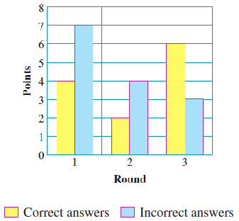 Delbert participated in a student math competition at his school. There were three rounds of problem-solving. Delbert earns points for correct answers, but loses points for each incorrect answer. The bar graph shows Delbert’s results after three rounds.