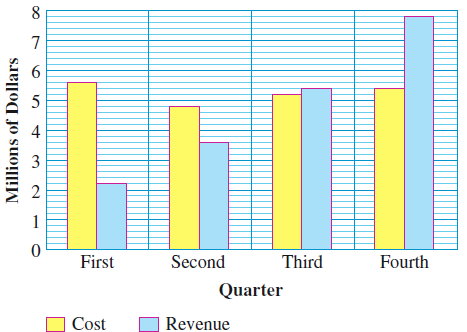 The bar graph shows the quarterly revenue and cost figures for Infocom, a new internet service provider.