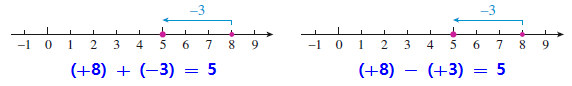 Both number lines look the same, and both problems have the same answer, +5. On each number line, we start at +8 and move 3 units to the left. This example illustrates an important fact.